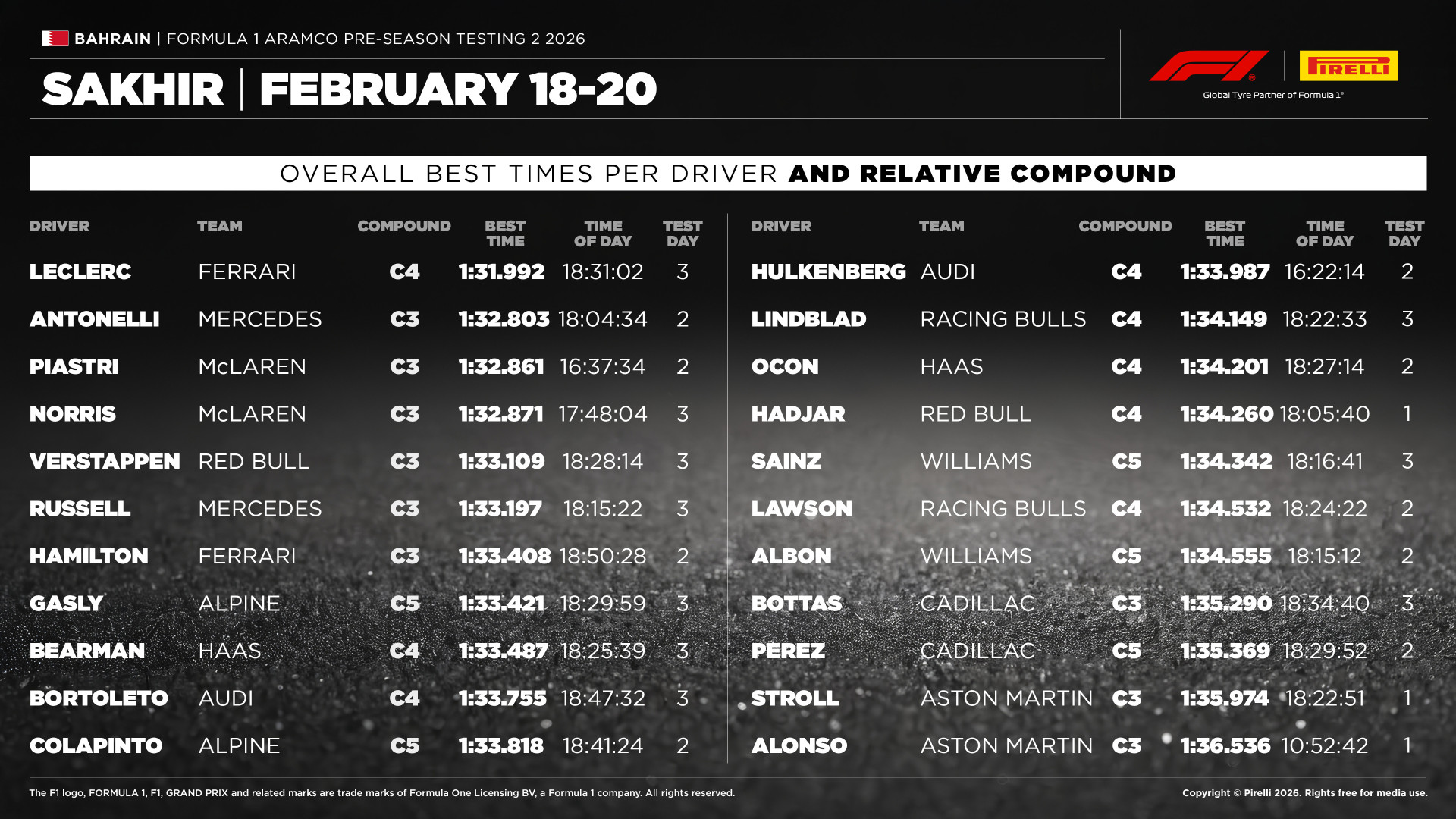 Charles Leclerc ment be egyedül 1:32 alá, de másik négy gyorskörével is megnyerte volna a teszt nem hivatalos időmérőjét, akkora különbséggel végzett a közvetlen élmezőny előtt. Persze ezeket a köröket a C4-es keveréken futotta, így a Pirelli 2026-os keverékei közti különbségeket kell segítségül hívni, ha ebből a követőboly C3-as idejeihez szeretnénk viszonyítani. Ez idén a C3-C4 közti lépcsőben 0,3-0,4 mp, vagyis átlagolva 0,35 mp-et kell hozzáadnunk a leggyorsabb körhöz, hogy nagyságrendileg megkapjuk az eggyel keményebb keverékkel reális potenciált. A végeredmény 1:32.342 – vagyis azonos gumikat használva sem talált volna legyőzőre a monacói. Ugyanezeket megismételjük a többi versenyző esetében is, akik nem a közepes keverékkel voltak pályán, figyelembe véve, hogy a C4-C5 közti lépcső tovébbi 0,5-0,6 mp, átlagolva 0,55 mp. További eltéréseket okoz, ha valaki nem az utolsó órában, a bahreini Happy Hour alatt futotta a gyorskörét, amikor már lement a nap és lehűlő pálya a legjobb körülményeket nyújtja a száguldáshoz. Ökölszabály szerint 3°C-ként 0,1 mp köridő növekedéssel számolok, vagyis a 26°C fokos zárórai kör és egy délutáni, 35°C-os kör között pusztán csak a pályaviszonyok javulása miatt 0,3 mp lesz a különbség.