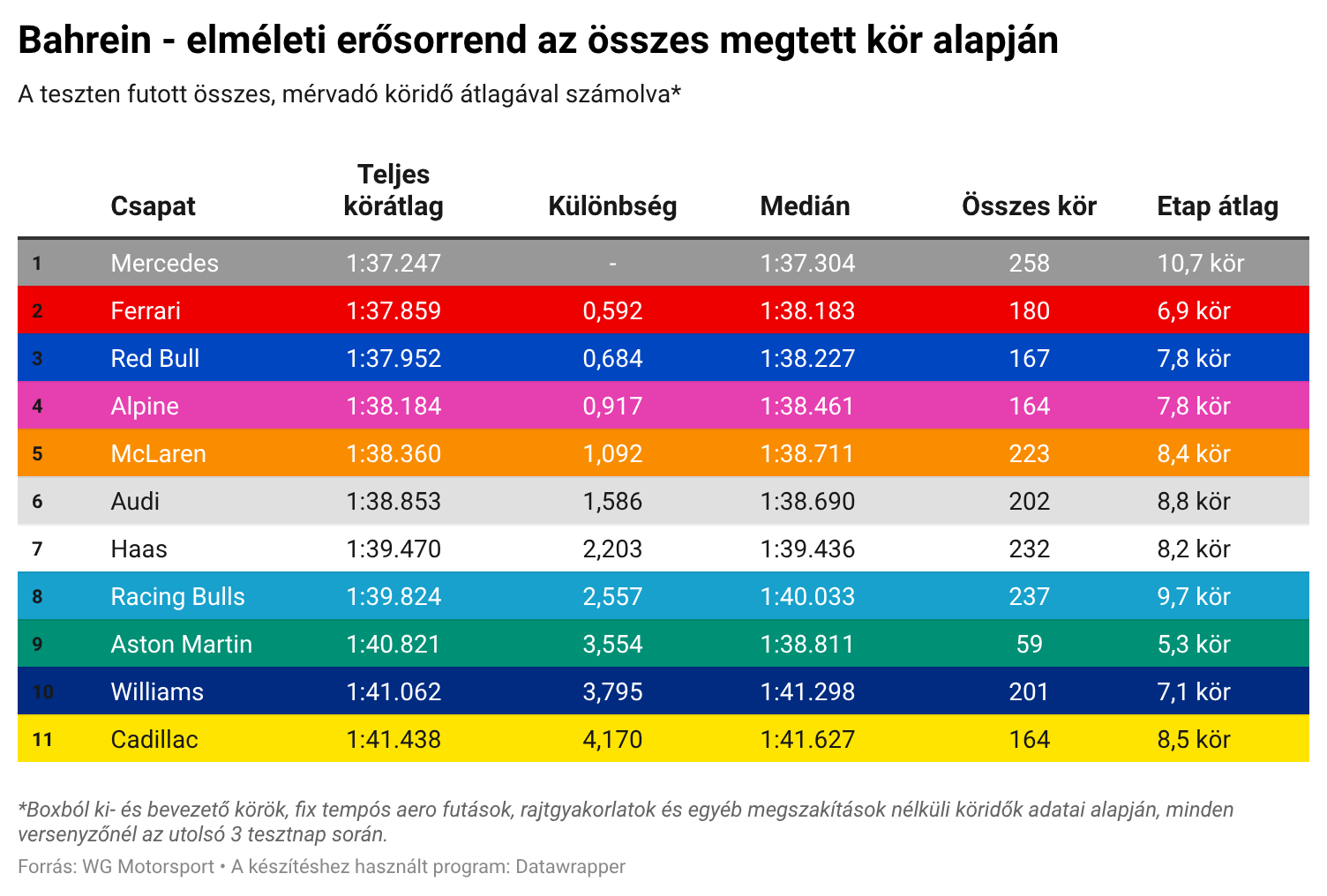 Az idei „időmérős” tesztkörök közül mindent kimazsolázva pedig az jobb oldali táblázatban látható sorrend alakul ki, láthatóan sokkal kisebb Ferrari előnnyel és nagyon szoros élmezőnnyel. A négy nagy három tizedre lenne egymástól, az Alpine vezeti a középmezőnyt, de másodperc feletti lemaradással, a Haas, az Audi és a Racing Bulls további 3-3-4 tizedre utánuk, míg a mezőny végén a Williams, majd a közel 3 mp hátrányban levő Cadillac és a szinte értékelhetetlen Aston Martin.